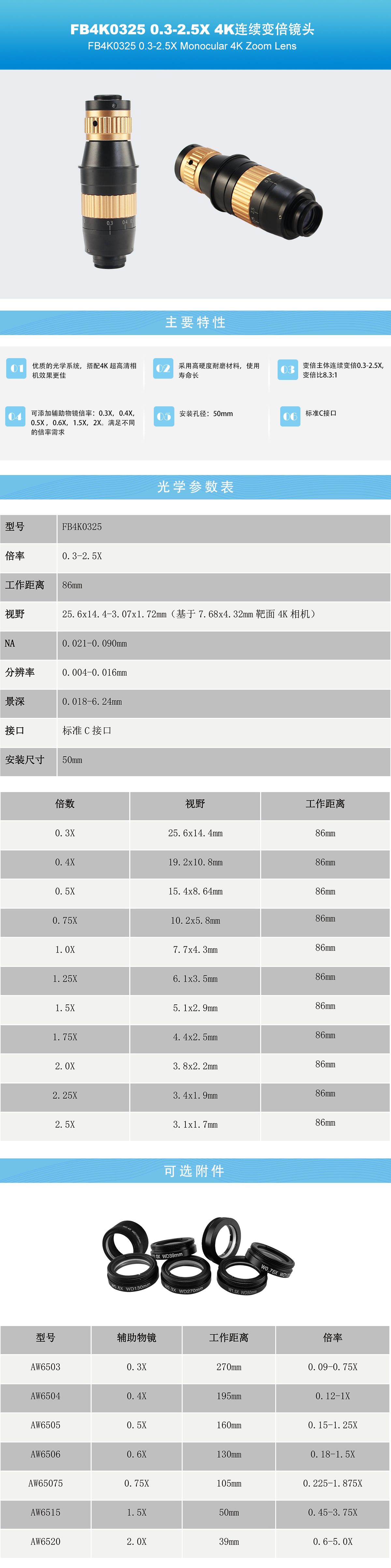 • FB4K0325 0.3-2.5X 4K连续变倍镜头