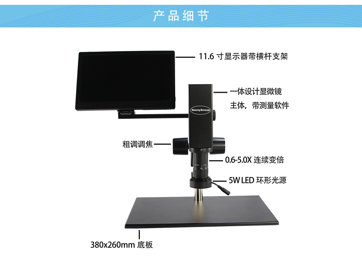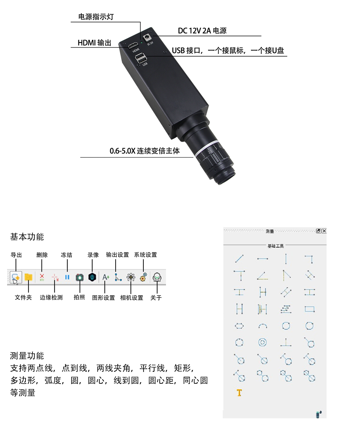 独特-体机设计,整体简洁美观,安装使用更方便。0.6-5.0X连续变倍,工作距离86mm,兼顾了测量和叠图的功能,简单易懂,调整数值多样化,测量数据以图片或excel 的形式保存;支持拍照,录像保存到U盘,在线也可直接浏览图片;1920*1080 全高清图形输出,卓越的色彩还原。