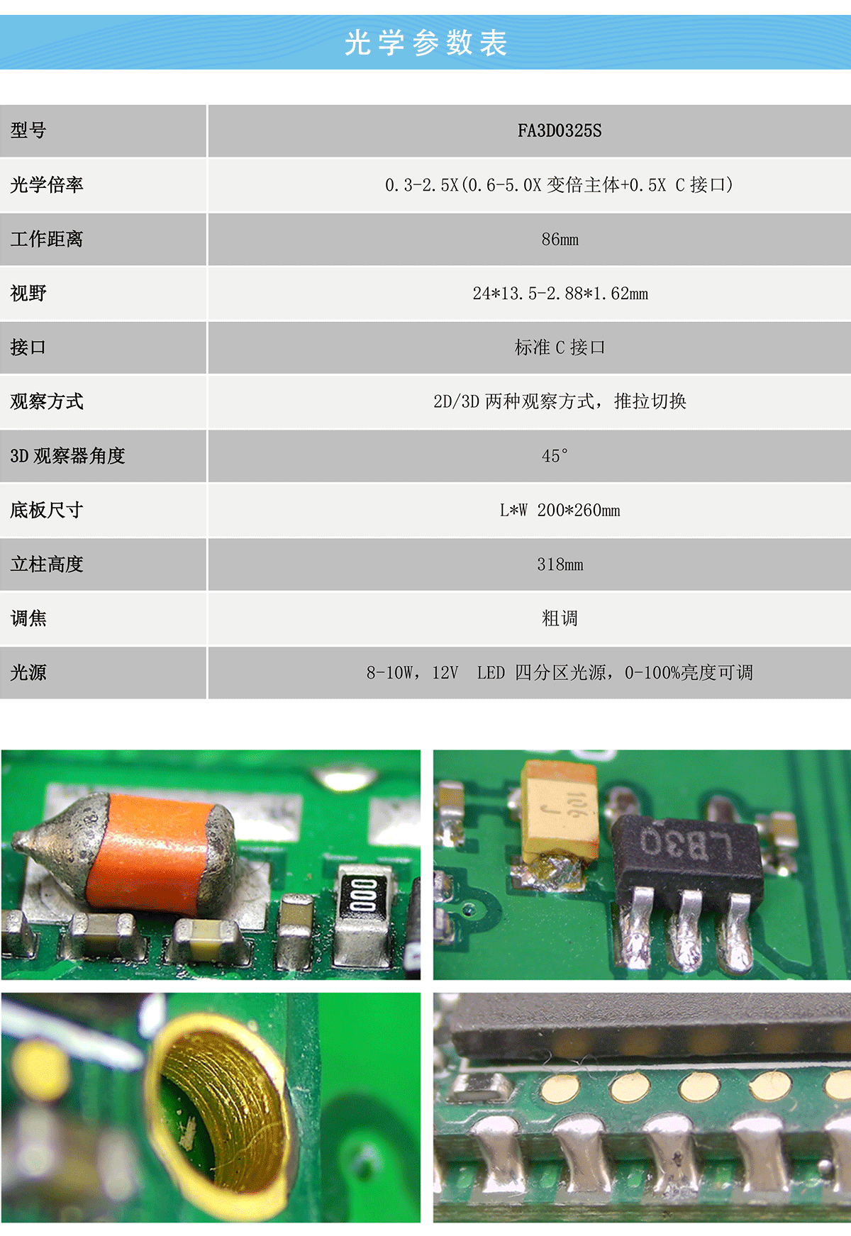 • 0.6-5.0X 连续变倍,标准C接口,2D/3D两种观察方式,360度3D旋转全方位检查,3D观察角度:45度,工作距离:2D:86mm,3D:50mm