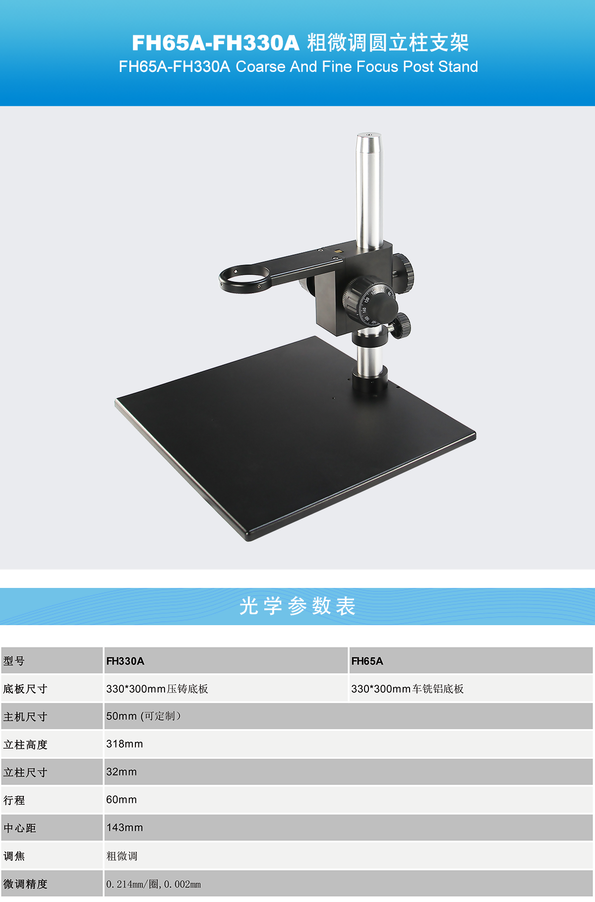 精密粗微调圆立柱调焦支架,高硬度耐磨材料;主体安装直径:φ50mm(可定制),立柱高度:318mm,底板尺寸:330*300mm,行程:67mm,微调精度:0.002mm,0.214mm/圈