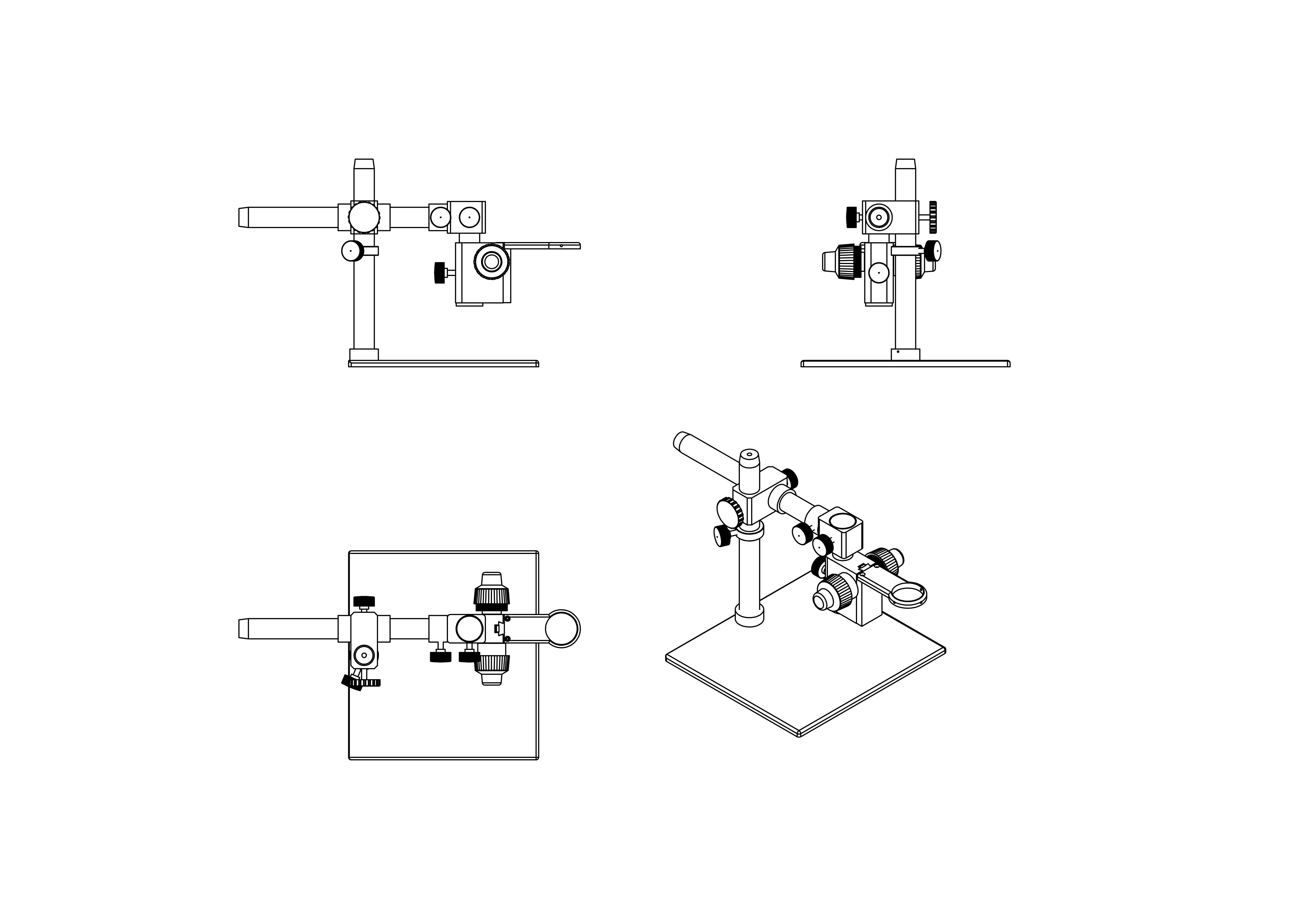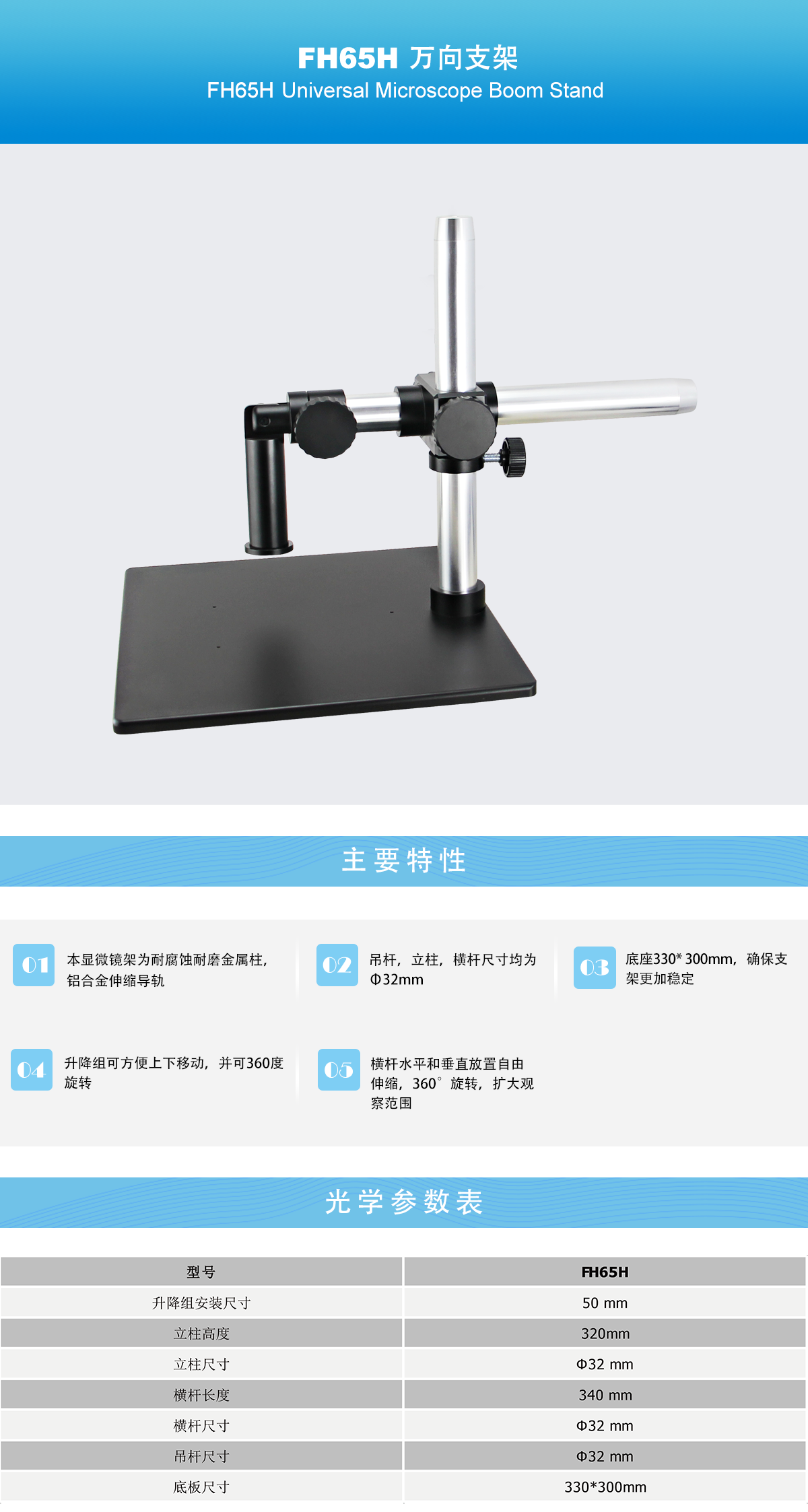 采用高硬度耐磨材料,铝合金伸缩导轨吊杆,立柱,横杆尺寸均为Φ32mm,底座330*300mm,确保支架更加稳定升降组可方便上下移动,并可360度旋转横杆水平和垂直放置自由伸缩,360°旋转,扩大观察范围