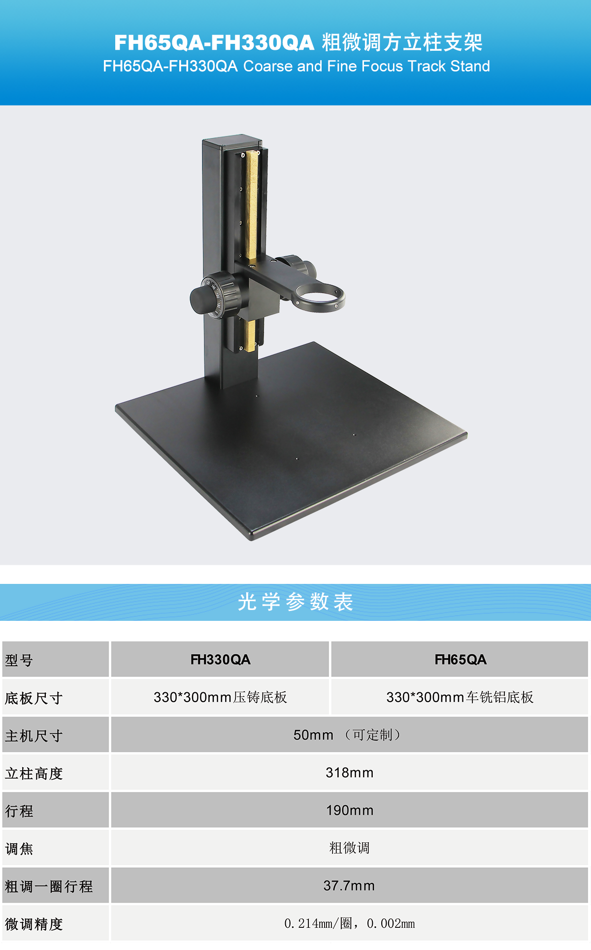 精密粗微调方立柱调焦支架,高硬度耐磨材料;主体安装直径:φ50mm(可定制),立柱高度:318mm,底板尺寸:330*300mm,行程:260mm,微调精度:0.002mm,0.214mm/圈