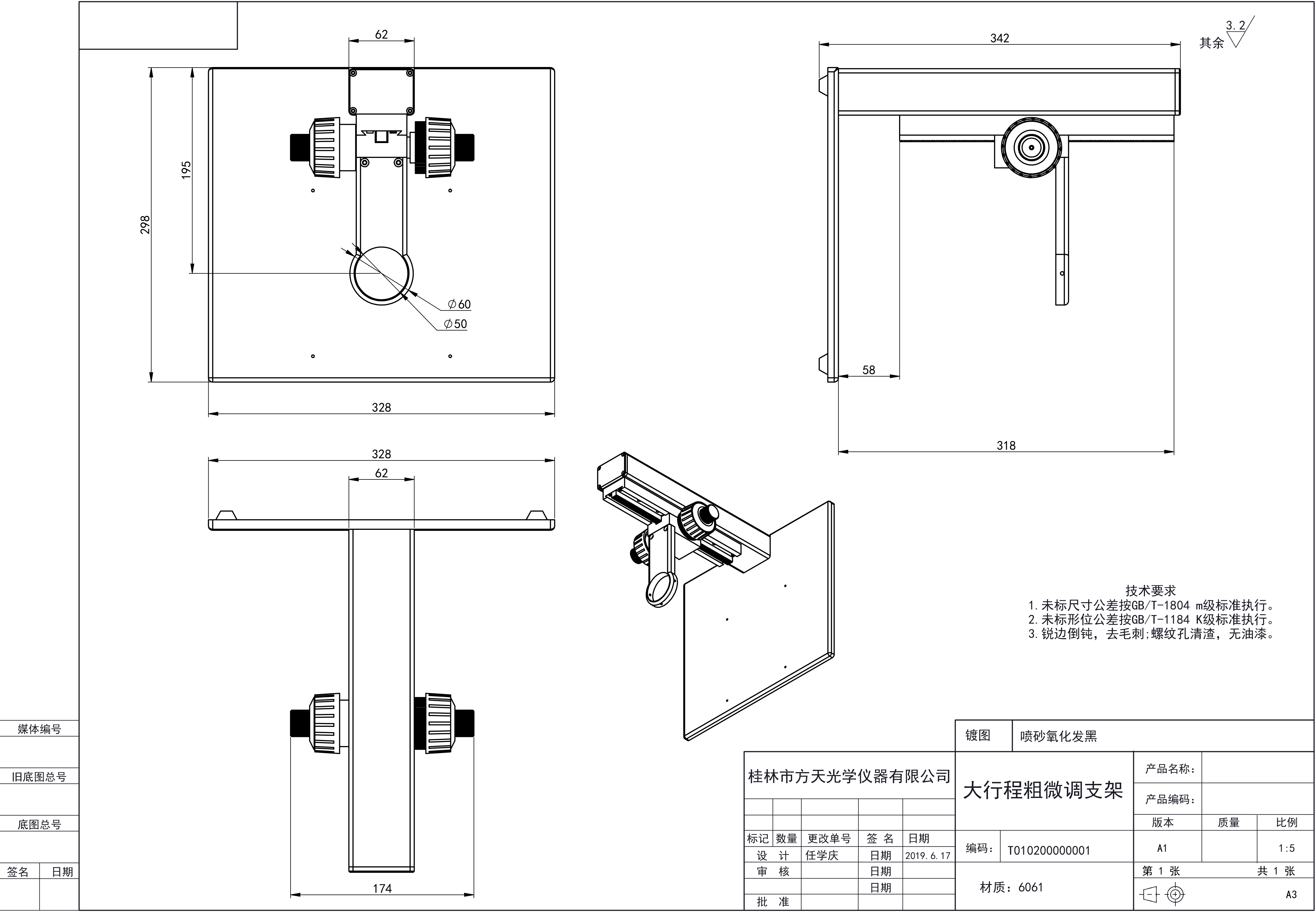 • 精密粗微调方立柱调焦支架,高硬度耐磨材料;主体安装直径:φ50mm(可定制),立柱高度:318mm,底板尺寸:330*300mm,行程:260mm,微调精度:0.002mm,0.214mm/圈