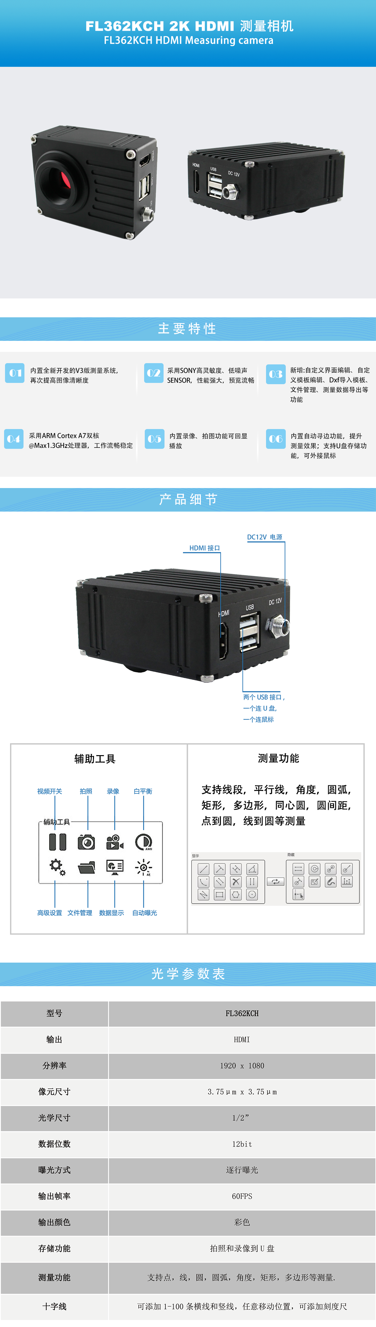 200万像素1080P 高清图像输出,1/2”CMOS 传感器,60FPS,U盘保存图像或视频,内置测量软件,HDMI输出。