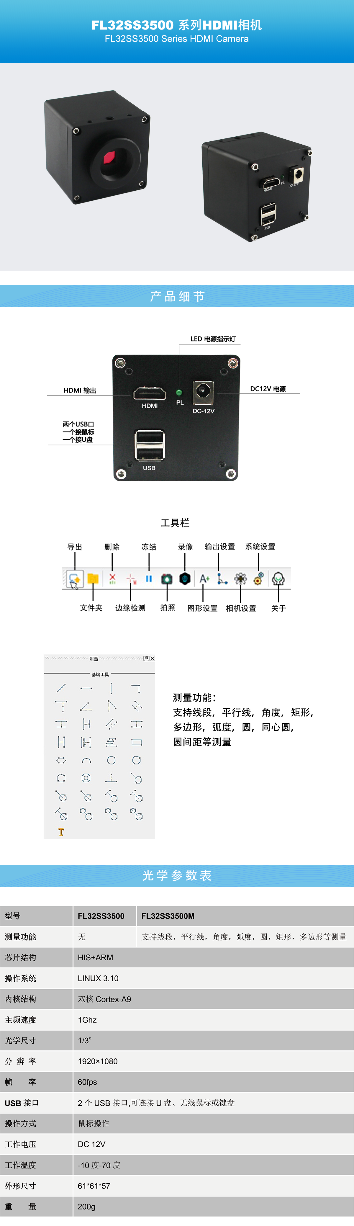 FL32SS3500 HDMI系列摄像机是一款HDMI接口的200万像素的高速摄像机,分辨率1920*1080,图像可以达到每秒60帧画面。 本摄像机简化了操作流程,兼顾了测量和叠图的功能,简单易懂,调整数值多样化,可以观看多种情况下的物体。