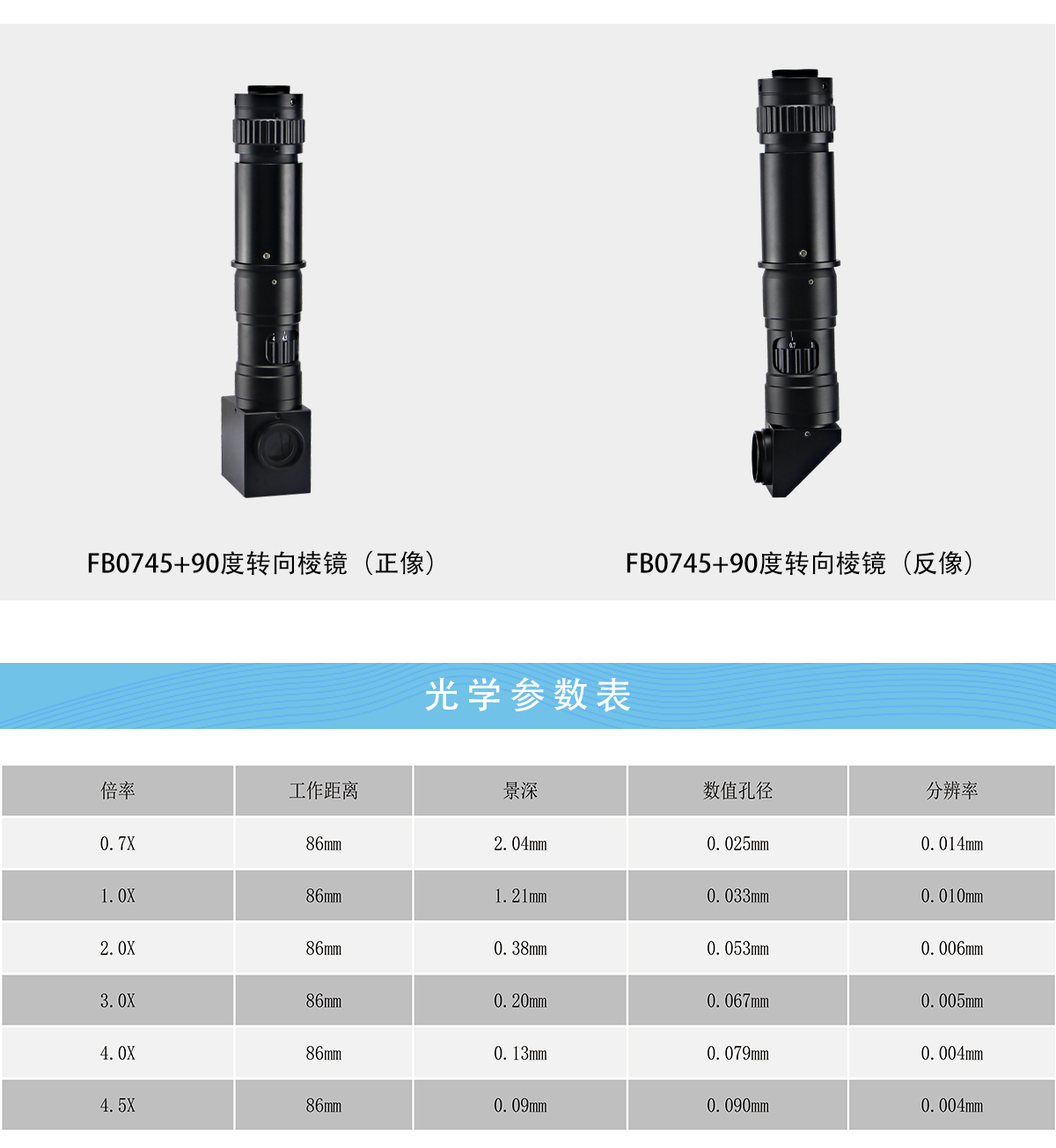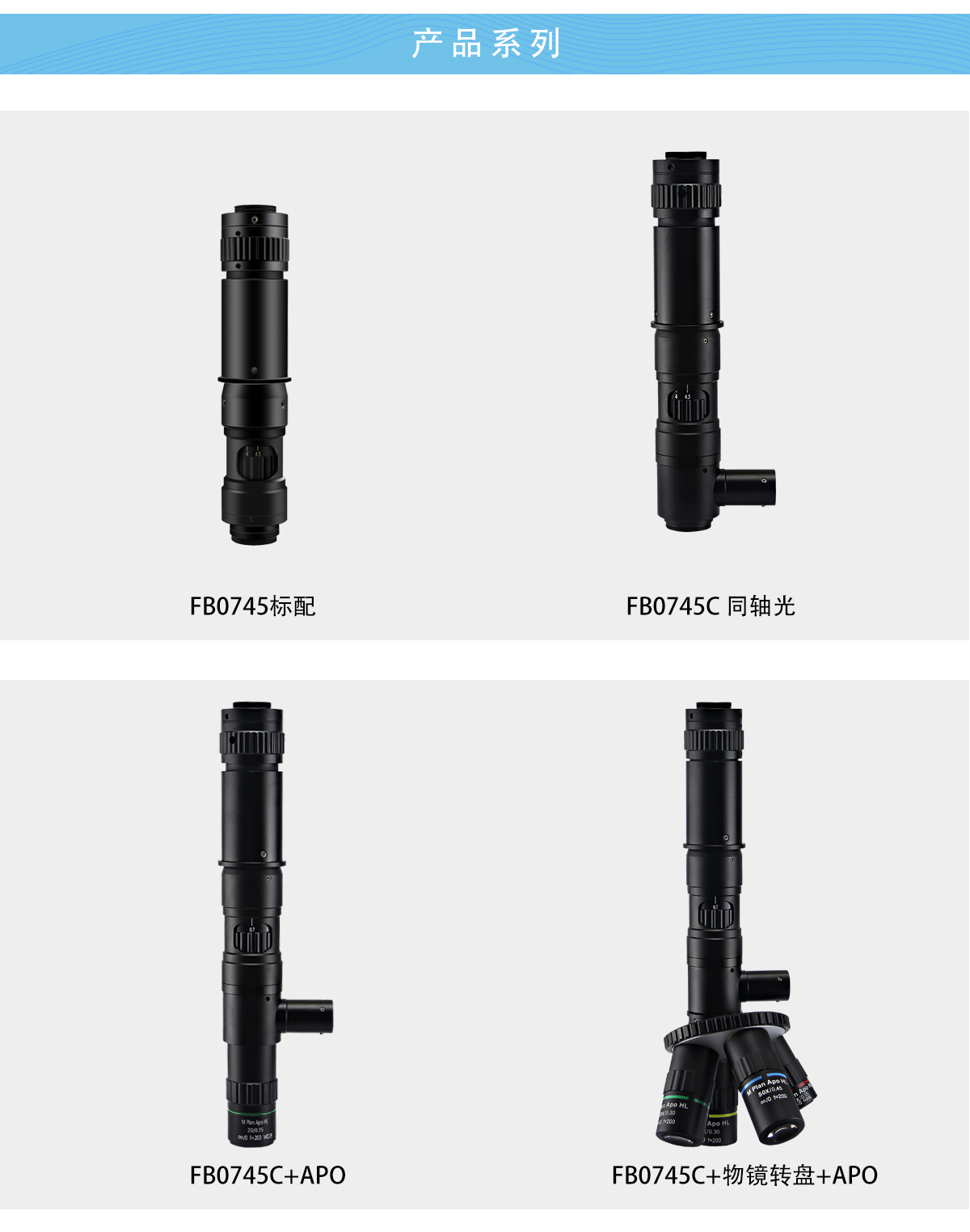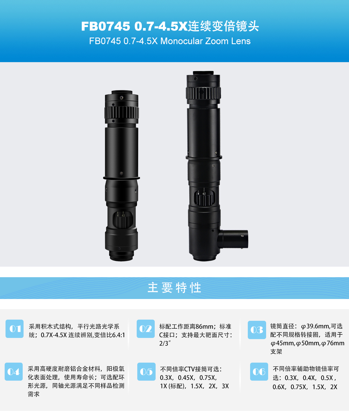 0.7-4.5X 连续变倍,86mm 工作距离,采用积木式结构,平行光路光学系统, 标准C接口,支持最大靶面尺寸2/3”,可选配不同倍率CTV接筒和辅助物镜满足不同样品的需求。
