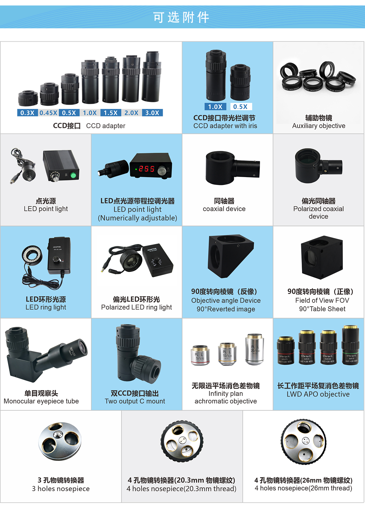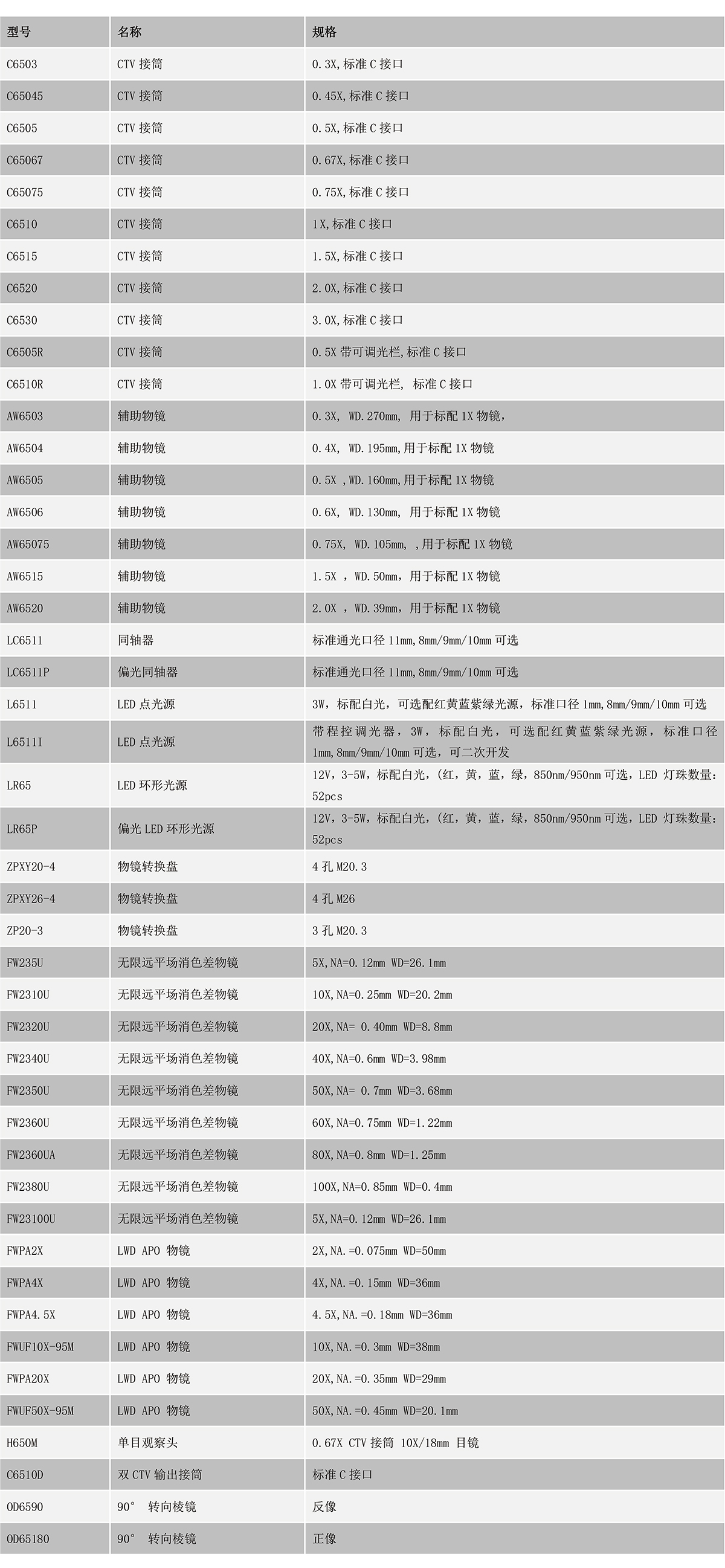 • 0.7-4.5X 连续变倍,86mm 工作距离,采用积木式结构,平行光路光学系统, 标准C接口,支持最大靶面尺寸2/3”,可选配不同倍率CTV接筒和辅助物镜满足不同样品的需求。