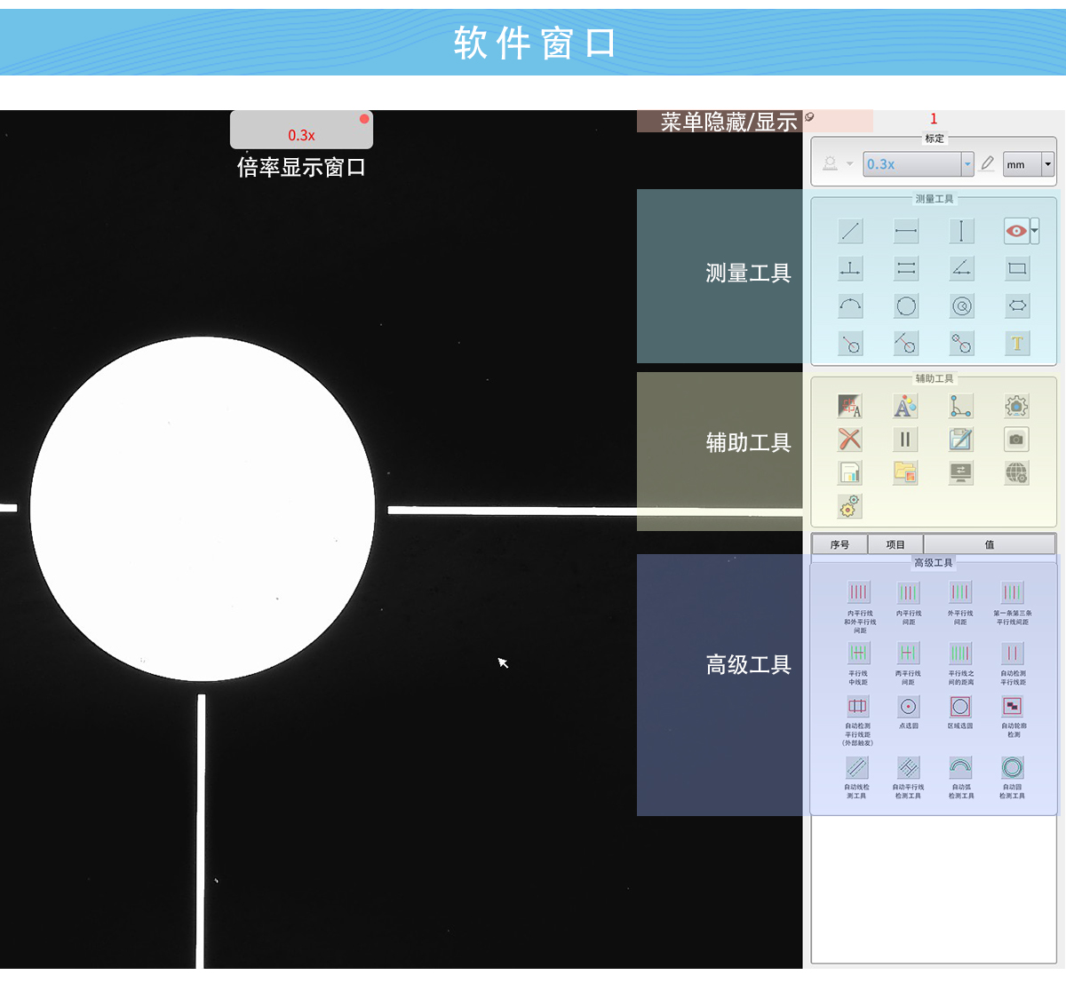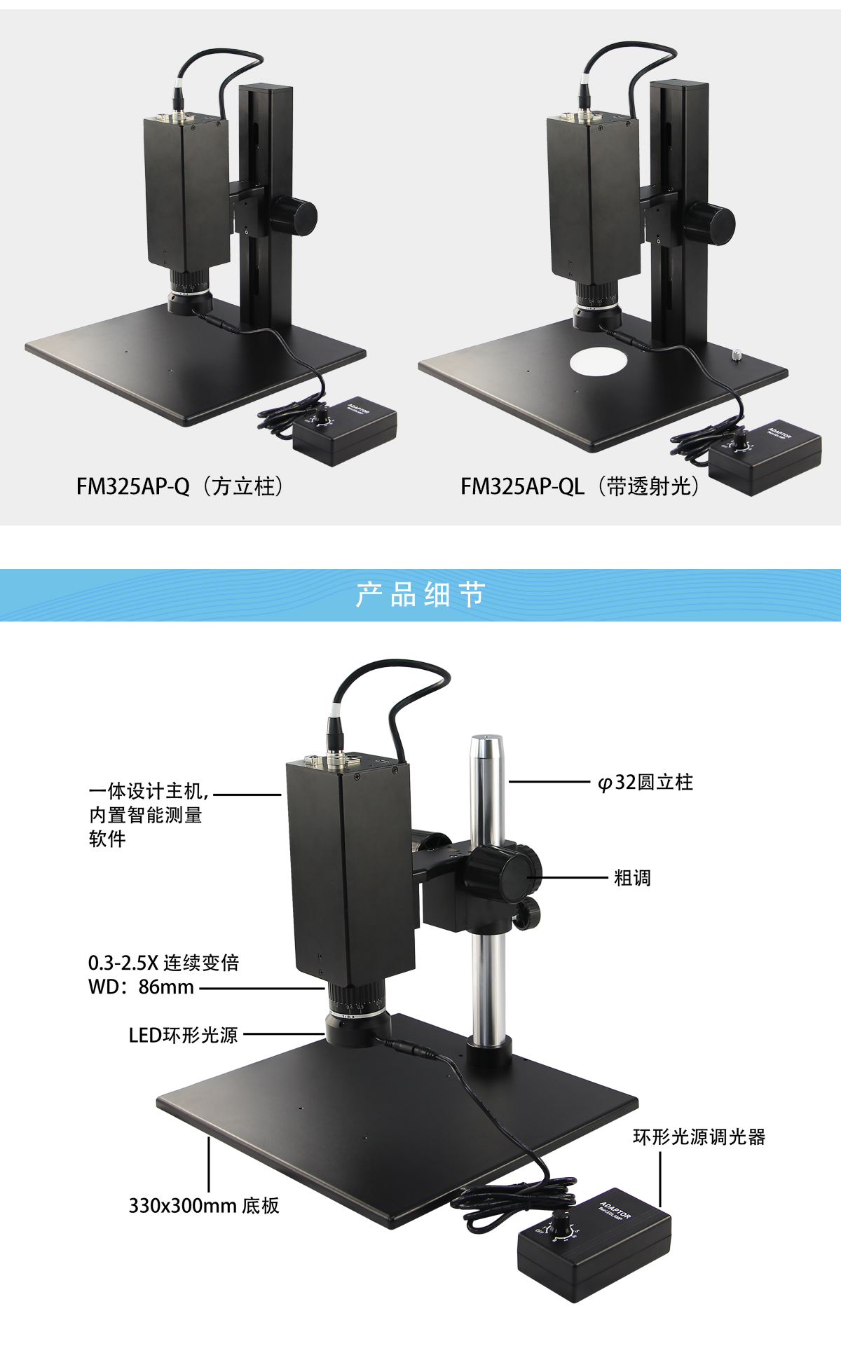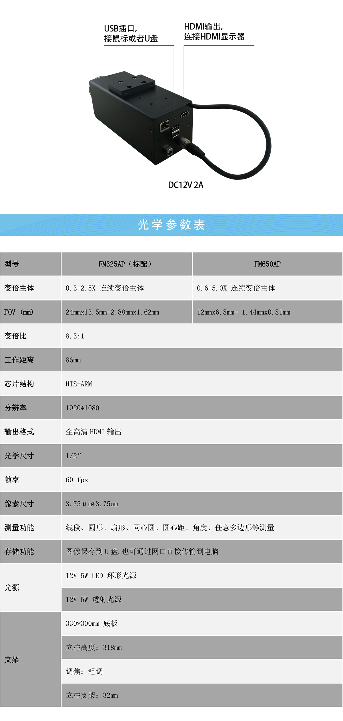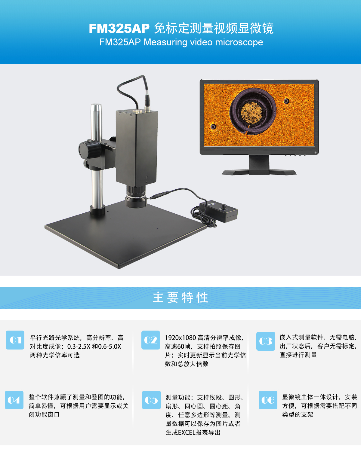 0.3-2.5X 或0.6-5.0X 连续变倍主体,实时更新和显示当前倍率,无需标定直接测量,内置程序无需电脑,1080P 高清图像输出。