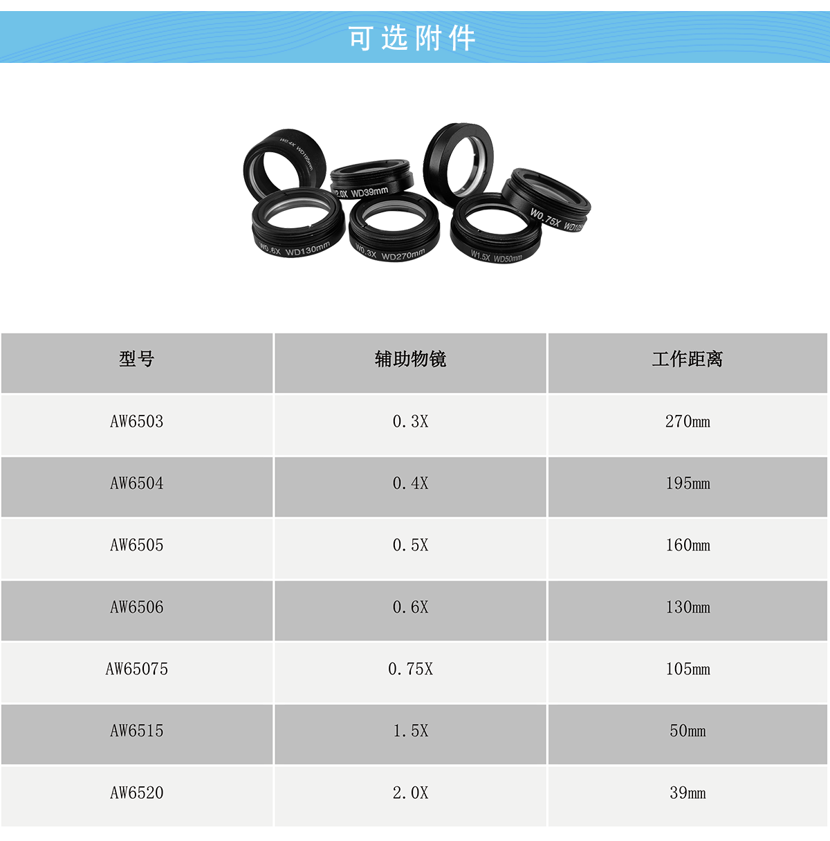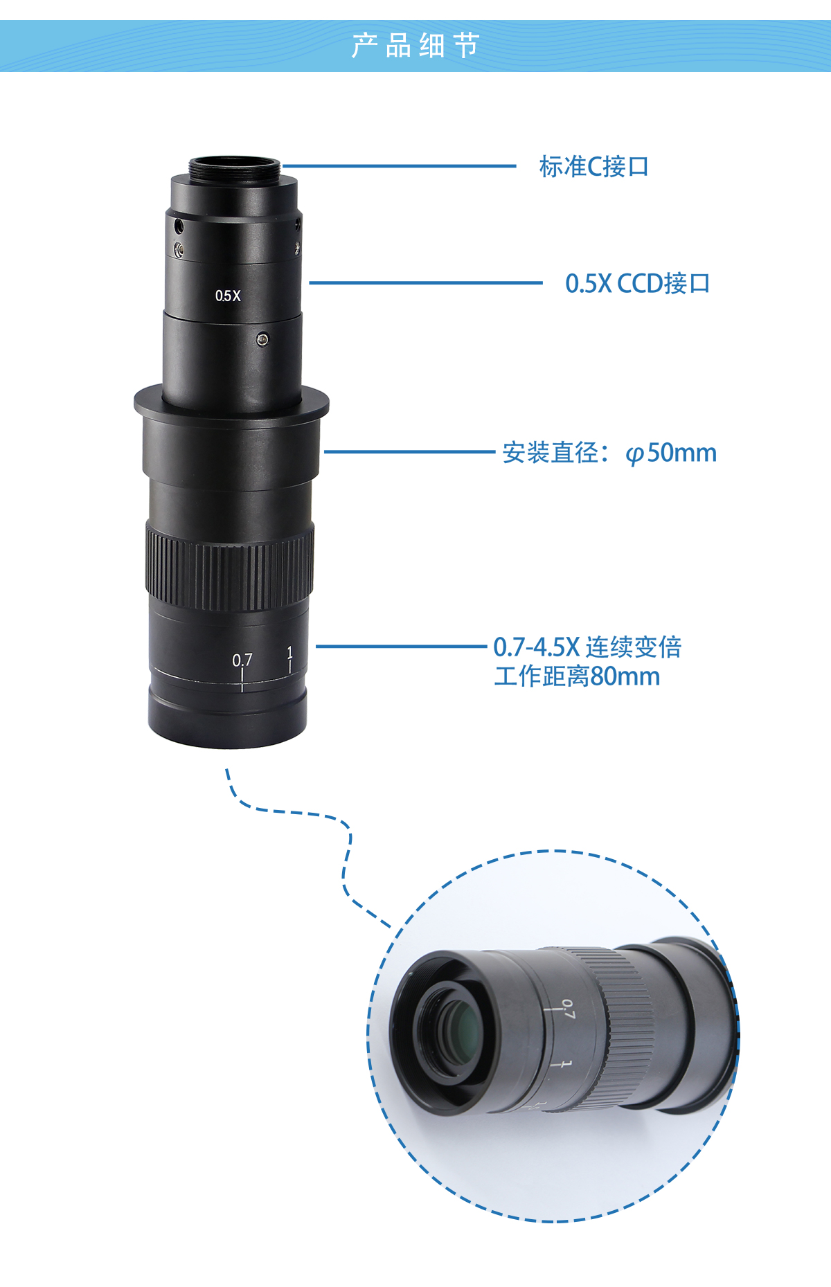 0.7-4.5X 连续变倍,标准C接口,80mm 工作距离,0.3X,0.5X,1X CTV 接筒可选