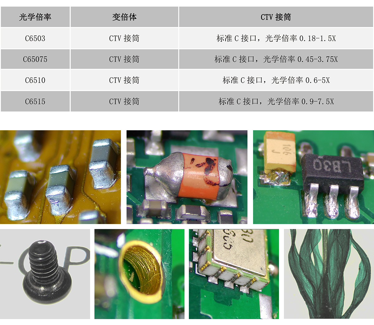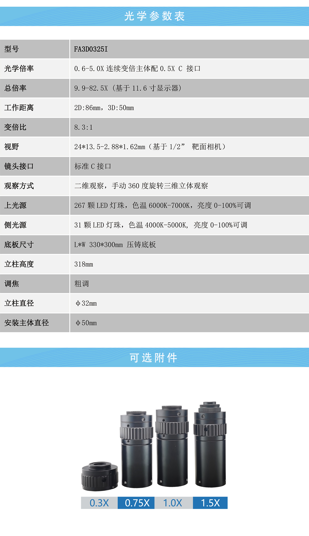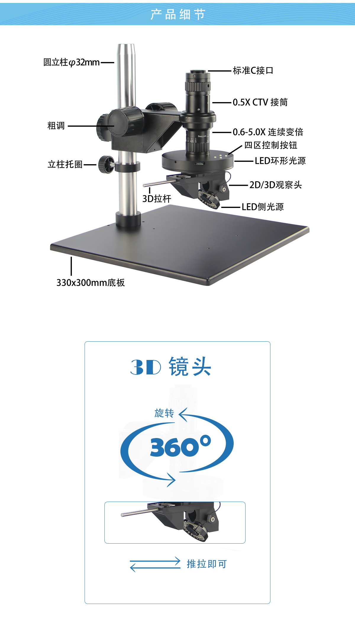 0.6-5.0X 连续变倍,标准C接口,支持二维和三维360度旋转观察,3D物镜观察角度45度,增加侧光源跟随三维观察头旋转照明