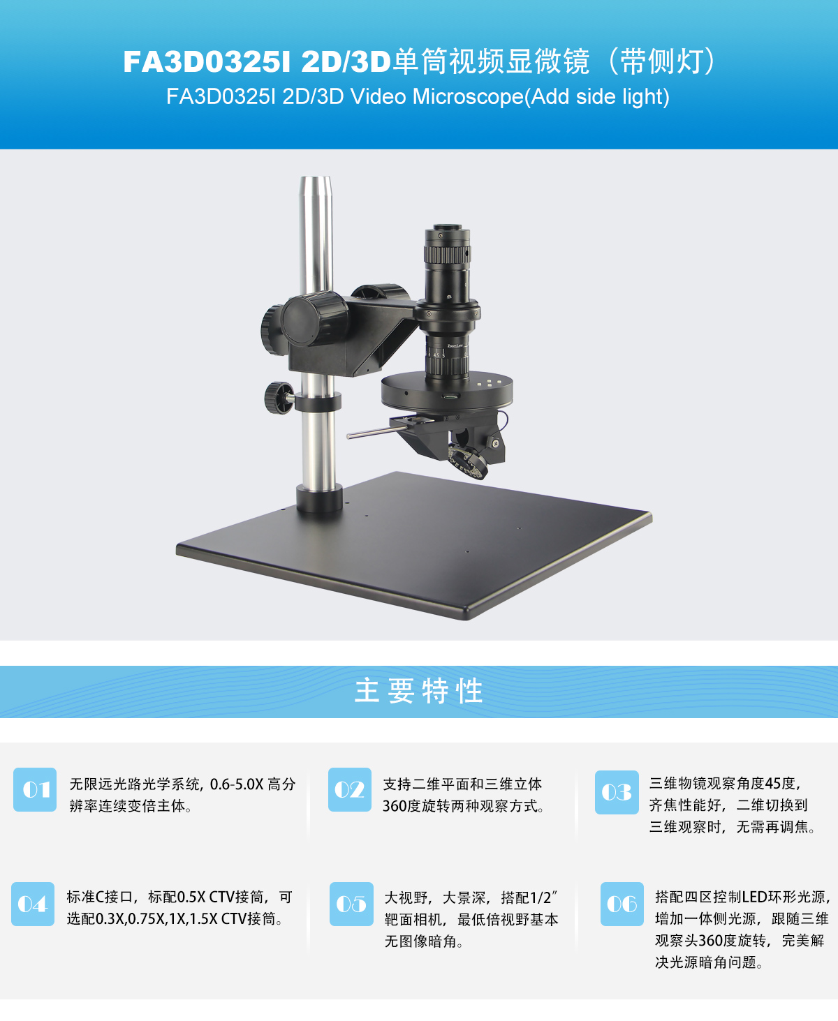 • 0.6-5.0X 连续变倍,标准C接口,支持二维和三维360度旋转观察,3D物镜观察角度45度,增加侧光源跟随三维观察头旋转照明
